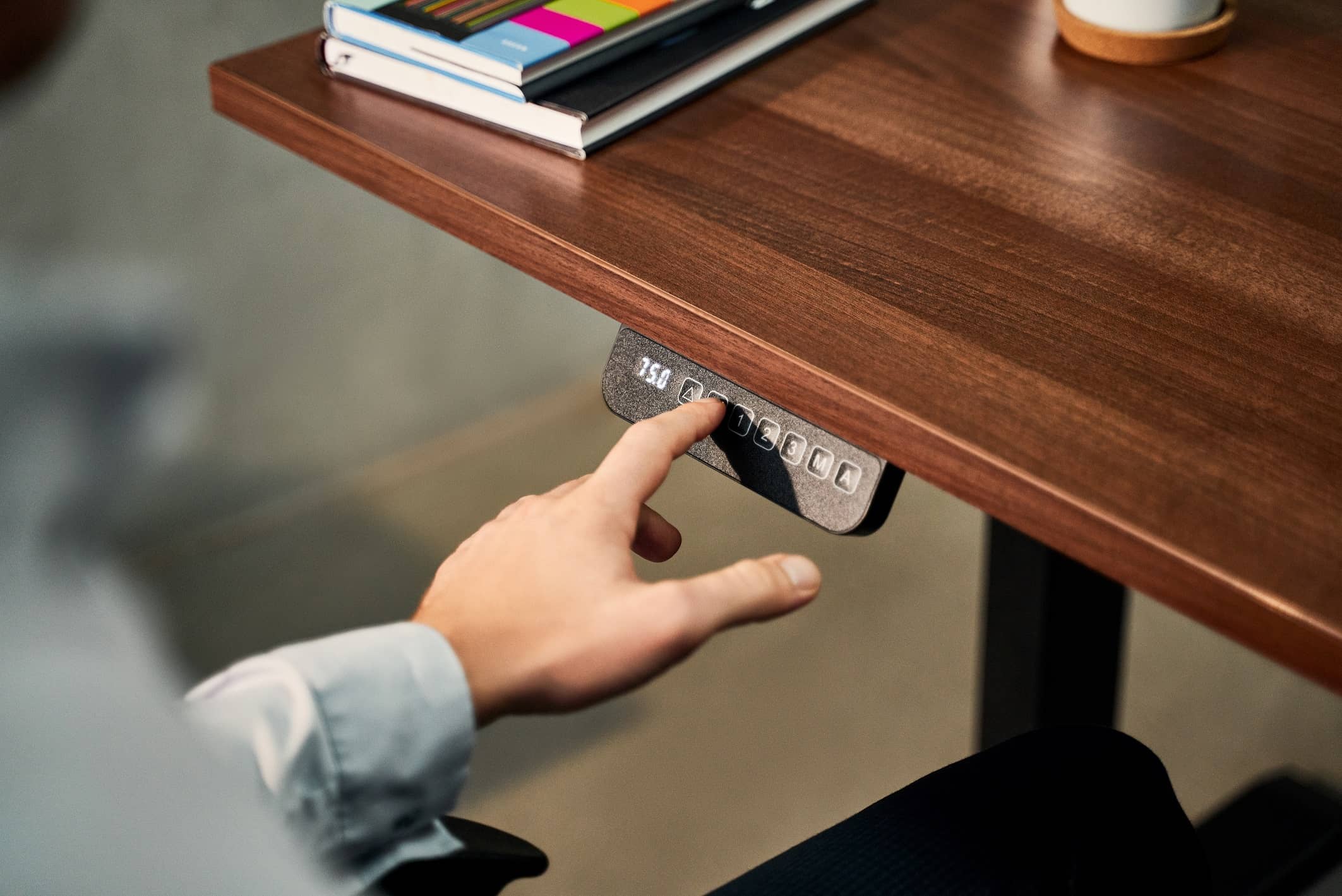 Elektricky stavitelný stůl můžete ovládat buď přidržením tlačítek se šipkami, nebo si jednotlivé výšky uložíte do paměťové jednotky. To má dvě výhody: po stisknutí tlačítka stůl sám vyjede do určené polohy a výšku desky nemusíte při každé změně polohy ladit.