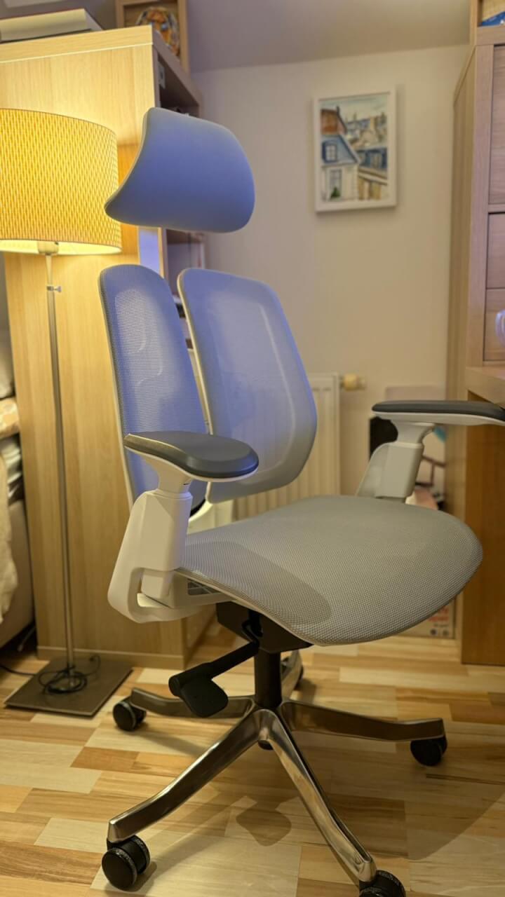 Maximálně mi vyhovují možnosti nastavení židle. Posouvat se dají područky i opěrka hlavy, takže mohu během práce měnit svoji polohu a tomu přizpůsobovat i židli. Každodenní sezení u počítače je jedním z důvodů, proč trpím na bolesti hlavy a migrény, ty se teď ovšem v posledních týdnech nedostavily. Správně nastavená židle mi pomáhá držet při práci tělo v ideální poloze. Samozřejmě také lépe vidím na monitor. Nastavitelná hlavová opěrka je skvělá!