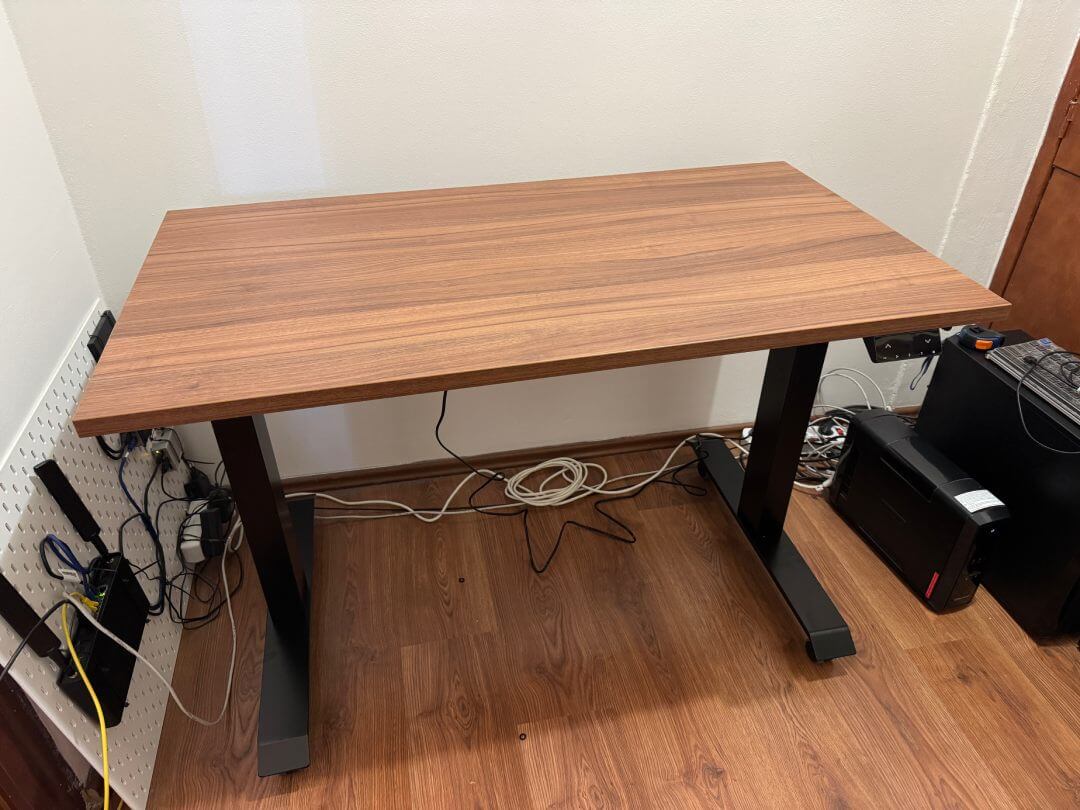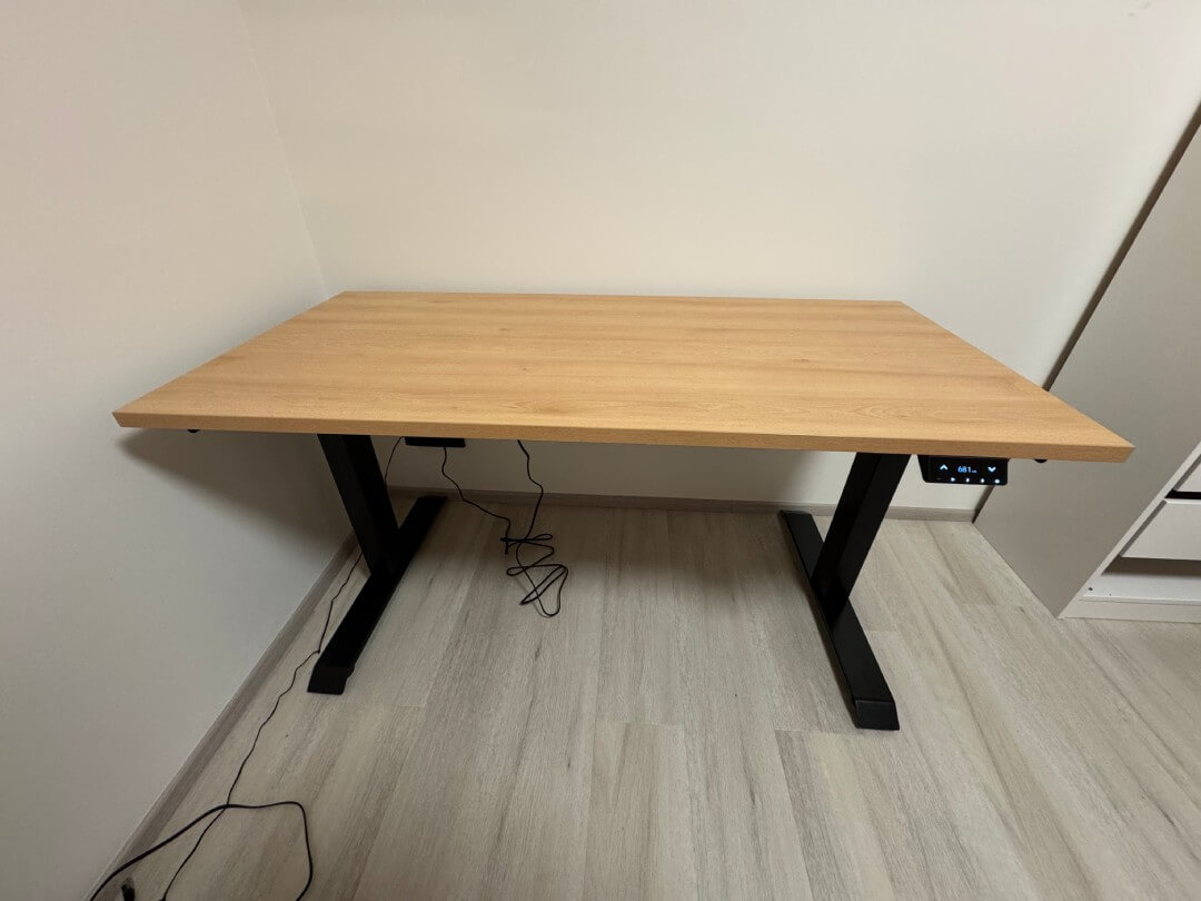 Sestavení stolu zabralo cca půl dne (zhruba 6-8 hodin) od vybalení přes sestavení nohou, vyřešení držáku kabelů, vycentrování nohou na desku s přesností na několik desetin milimetru (nechci mít stůl křivě), finálnímu připevnění všeho k desce pomocí akušroubováku až po ustavení, vyvážení stolu a vyzkoušení. Nakonec vše fungovalo na první pokus. Dokonce si stůl pamatuje nastavení všeho i při odpojení od elektřiny - pračky a myčky by se mohly inspirovat! :-)