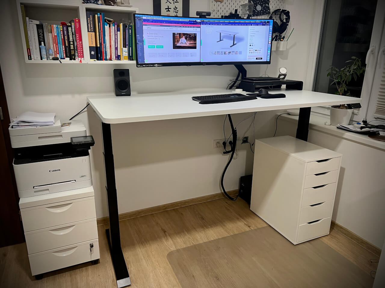 Sestavení stolu zabralo cca půl dne (zhruba 6-8 hodin) od vybalení přes sestavení nohou, vyřešení držáku kabelů, vycentrování nohou na desku s přesností na několik desetin milimetru (nechci mít stůl křivě), finálnímu připevnění všeho k desce pomocí akušroubováku až po ustavení, vyvážení stolu a vyzkoušení. Nakonec vše fungovalo na první pokus. Dokonce si stůl pamatuje nastavení všeho i při odpojení od elektřiny - pračky a myčky by se mohly inspirovat! :-)