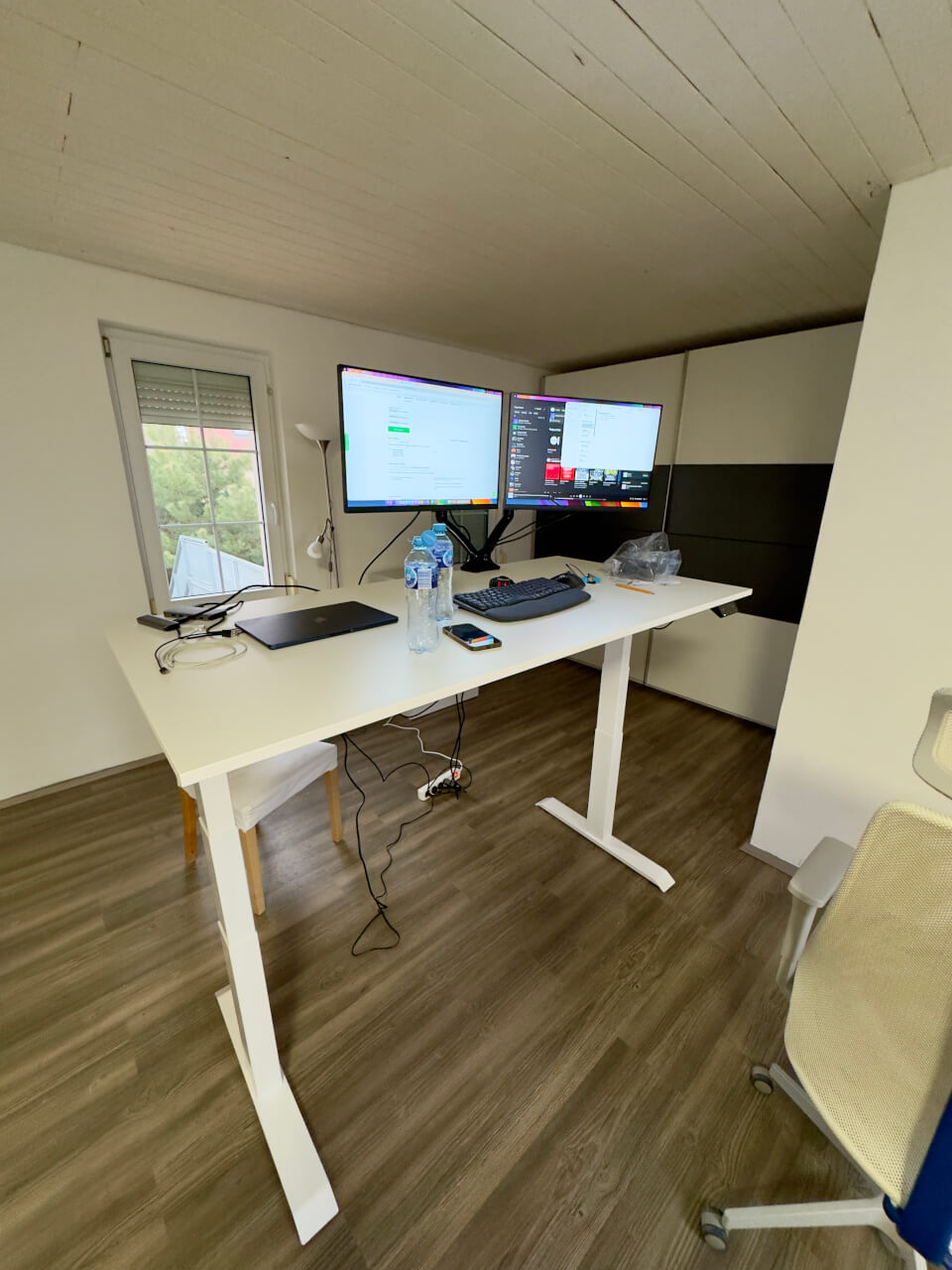 Sestavení stolu zabralo cca půl dne (zhruba 6-8 hodin) od vybalení přes sestavení nohou, vyřešení držáku kabelů, vycentrování nohou na desku s přesností na několik desetin milimetru (nechci mít stůl křivě), finálnímu připevnění všeho k desce pomocí akušroubováku až po ustavení, vyvážení stolu a vyzkoušení. Nakonec vše fungovalo na první pokus. Dokonce si stůl pamatuje nastavení všeho i při odpojení od elektřiny - pračky a myčky by se mohly inspirovat! :-)