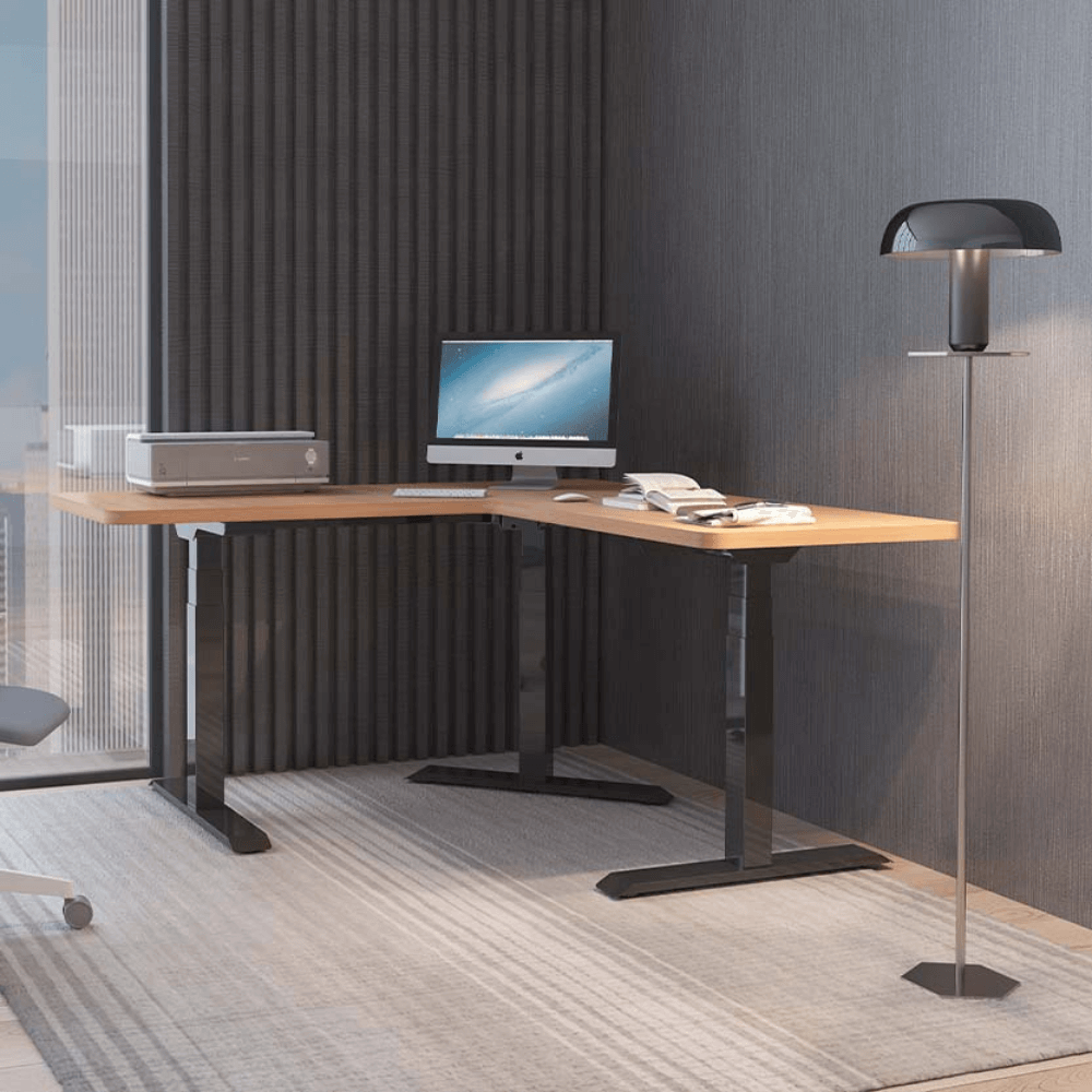 Elektrický stůl do tvaru L pomůže účastníkům u stolu měnit pracovní pozici mezi sezením a stáním a to i během schůzky.